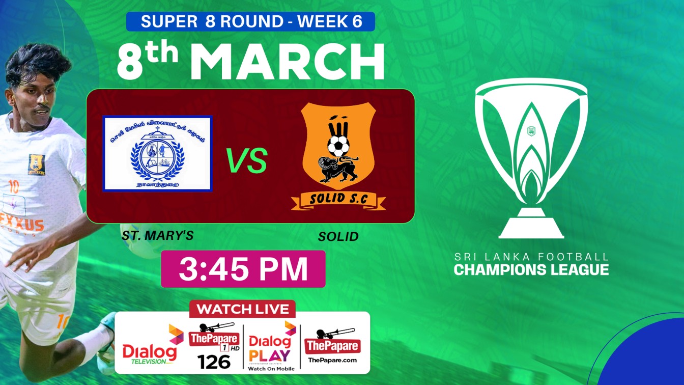 St Mary's FC will take on Solid SC in the Week 6 in Super 8 round of the Sri Lanka Football Champions League 2025/26 on 08th March at the Racecourse Stadium, Colombo.